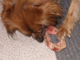 Und unser Rüpel hat von Kirsten - vielleicht damit er ihren Herrn Meier verschont - einen großen Markknochen bekommen, und er tobt sich wirklich an dem Teil aus, denn er hat lange nicht kapiert, dass er von innen nach außen arbeiten muss. Hier nochmal danke dafür. Zuhause werden wir weiter üben.