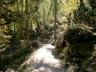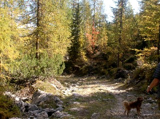 Steinig führt er durch herbstlich romantischen Wald. Zwischendurch ein Blick auf die Rotwand neben uns,