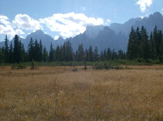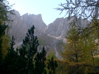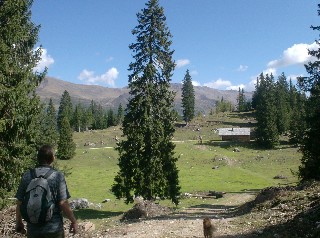 und auf die Gegend unsrer gestrigen Tour. Dort drüben weiter rechts liegt auch die Alpe Nemes Hütte, wo wir heute evtl. noch hinwollen, und wo die Kühe des Almabtriebes vom Samstag ihren Sommer verbracht haben. Aber jetzt gehts erst mal auf den Wanderweg 18 unterhalb der Sextener Rotwand nach Süden zum Kreuzbergpass, und dann wollen wir auf der anderen Seite wieder zurück zur gegenüberliegenden Alm.