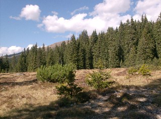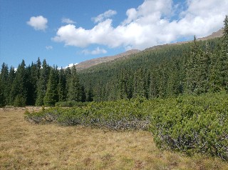 und kommen nach fast einer Stunde ständiger Steigung mehr als 300 Meter höher am Hochmoor an. Hier wachsen nur noch Krüppelkiefern, die Bäume sind bemoost, der weiche Torfboden riecht herrlich in der Sonne, und es ist einfach nur traumhaft. Sogar Bruno lief die ganze Zeit brav ohne Leine, also alles bilderbuchmäßig.