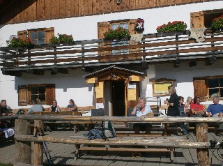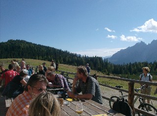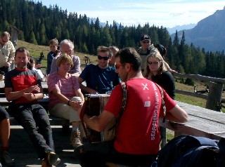 Aber erst gibts mal ein Radler, dann Speckknödel mit Krautsalat und hinterher einen Zirbelkiefer- und einen Almrosenschnaps. Ein fescher Geißenpeter spielt auf der Ziehharmonika und singt lustige und auch ernste Heimatlieder, und es ist fast schon kitschig, aber traumhaft schön.