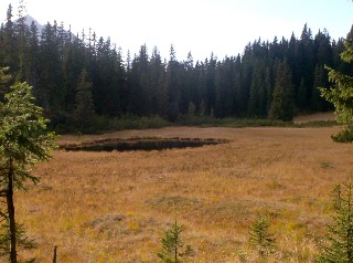 vorbei an einem kreisrunden Moorsee, über Schottersteine unterschiedlicher Größe, eine gute Stunde steil bergab.