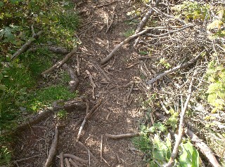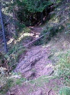und ganz unbequem, rollende tote Ästchen, glatte Steinplatten und freigespülte Wurzeln. Hier scheint lange keiner mehr gegangen zu sein. Irgendwo weit über uns werden krachend Bäume gefällt, ansonsten keinerlei Geräusche und keine Ahnung, wo hier der Caravanpark sein soll. Nur tiefer Abhang und nix als Bäume und wir. Aber die Beschilderung stimmt noch. Also mutig weiter.