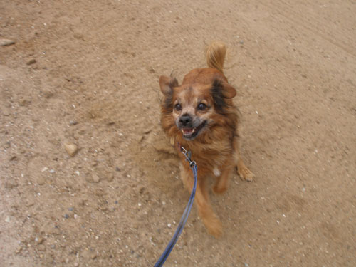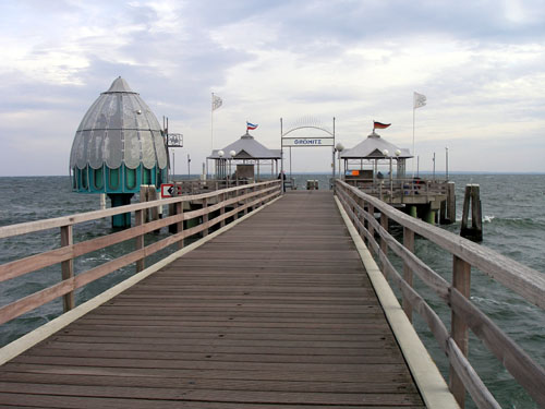 Peter lass ich mit Bruno an der Uferpromenade sitzen und lauf die 400 Meter auf der Seebrücke durch Wind und Gischt.
