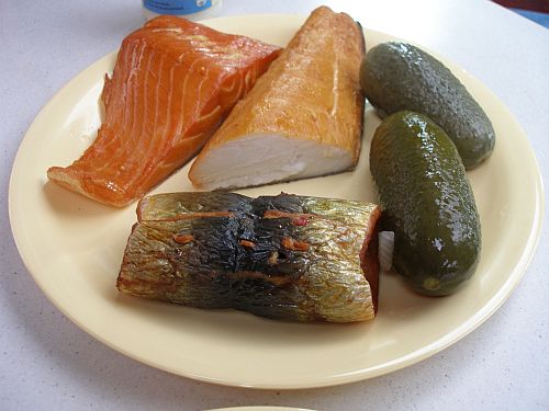 Dieser hier ist gut drauf, der andere schwächelt ein wenig. Fürs Abendessen nehmen wir noch Räucherfisch mit und machen uns auf den Rückweg.