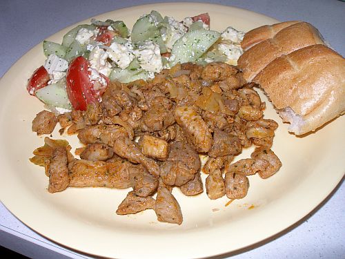 Pfannengyros und Salat. Vorher zum Aufwärmen ein Hühnersüppchen, denn die Hühnerbeine mussten weg - MHD erreicht.
