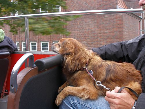 Bruno wirds langsam langweilig und er macht sichs bequem. Genauso lag er früher im Bussi hinter der Sitzbank und schaute stundenlang mit aufgelegtem Kopf nach vorn.