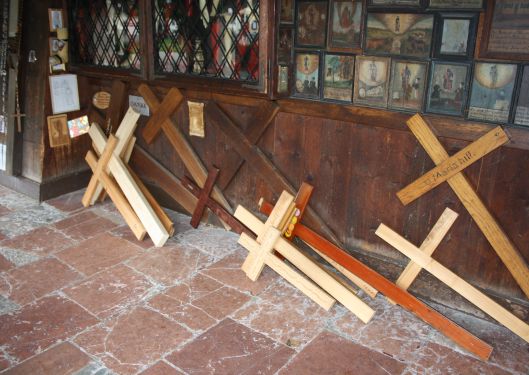 Sehr interessant und beeindruckend ist auch der Kreuzgang außen rum, der über und über mit Dankestäfelchen behängt ist. Auf einer Seite hängen etliche Beinschienen kleiner Kinder mit entsprechenden Danksagungen und es ist ein beklemmendes Gefühl, die Dinge anzuschauen.