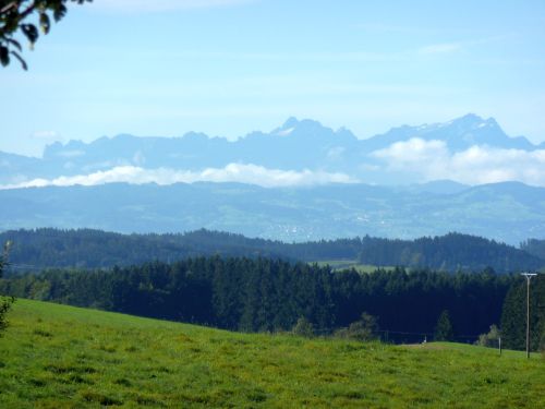 Die Feuchtigkeit des gestrigen Regens steigt auf, und wir haben einen herrlichen Blick auf die Schweizer Alpen.