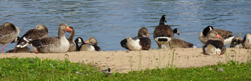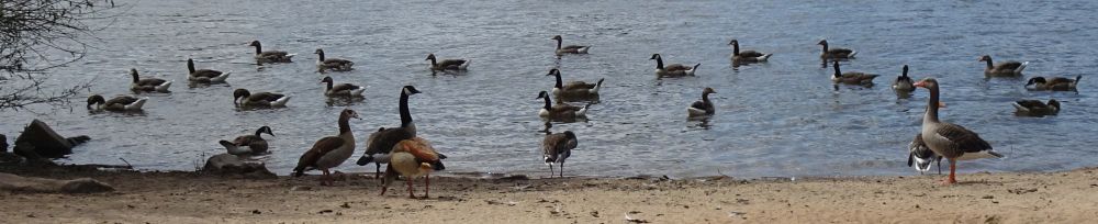 Das Hochwasser ist wieder weg, und die Gänse sind alle wieder da. Graugänse und ein paar Nilgänse schwimmen friedlich zusammen mit den sonst immer zickigen Kanadagänsen.