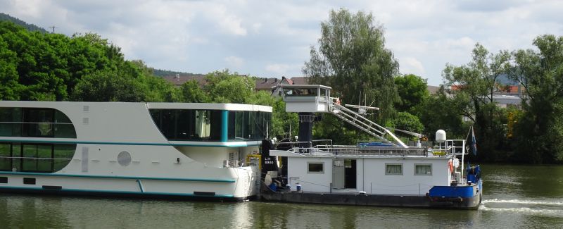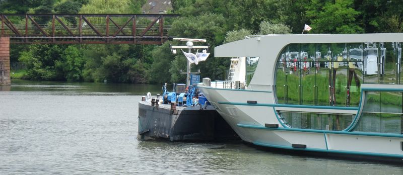 Heute gibts mal was ungewöhnliches zu sehen. Ein Hotelschiff kann wohl nicht mehr aus eigener Kraft die Heimfahrt antreten, und da klemmt sich einfach ein Teil davor und ein weiteres Schubschiffteil dahinter, und schon klappts.