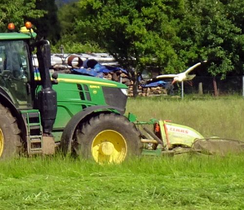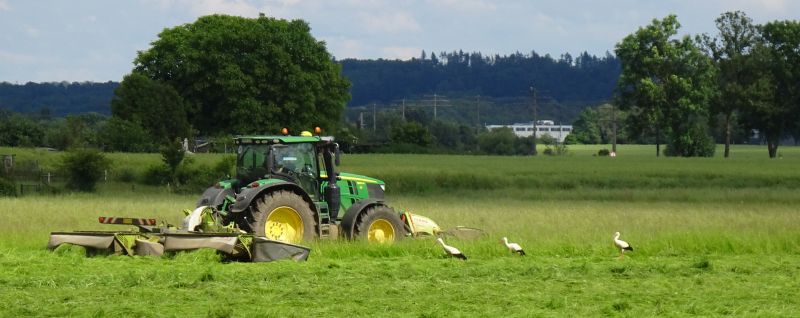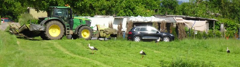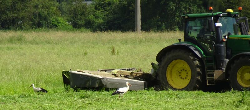 Durch den Mäher werden die Mäuse aufgeschreckt und sind für die Störche leichte Beute.