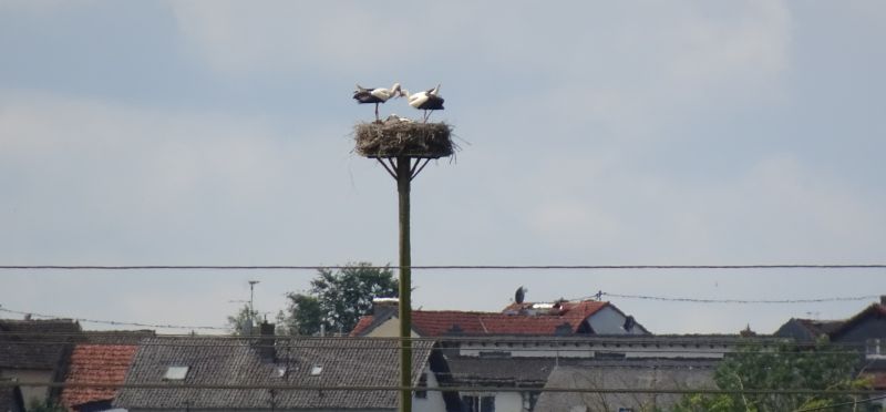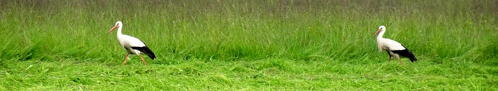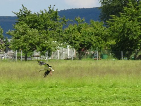 Beim Nachmittagsspaziergang treffen wir ganz viele Störche. Es waren mehr als 10, die da um den Bauern, der seine Wiese mähte, herumflogen.