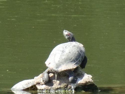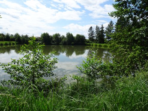 An der Bahn entlang gehts zum Angelteich, bei dem sich direkt auf der Mitte die Schildkröte sonnt.