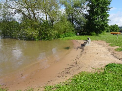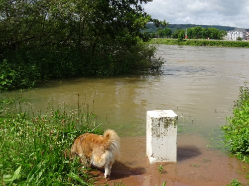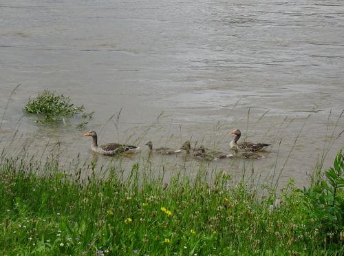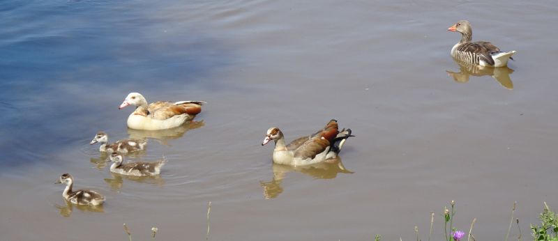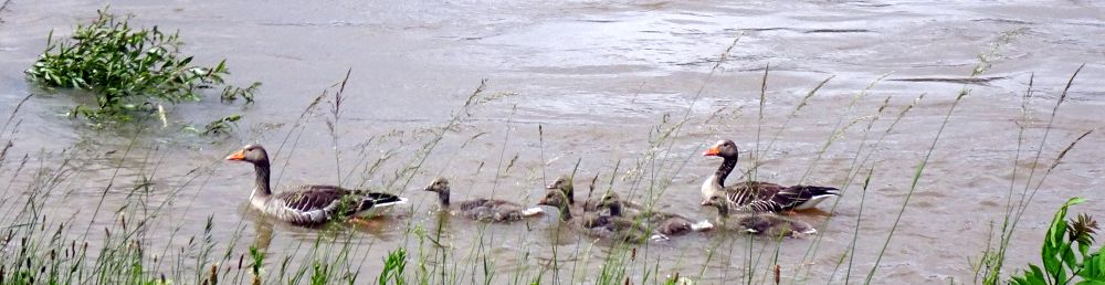 Die Gösselchen sind inzwischen gewachsen, und die großen Gänse sind alle drüben auf der anderen Seite, weils Hochwasser den Uferstreifen an der Schleuse überschwemmt hat.