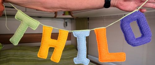 Namenbuchstaben holen, damit ich sie zusammenhäkeln kann. Das mach ich in