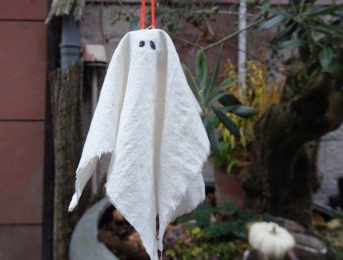 Halloween. Ein Bäumchen hängt voll mit kleinen Geistern. Und überall Kürbisse,