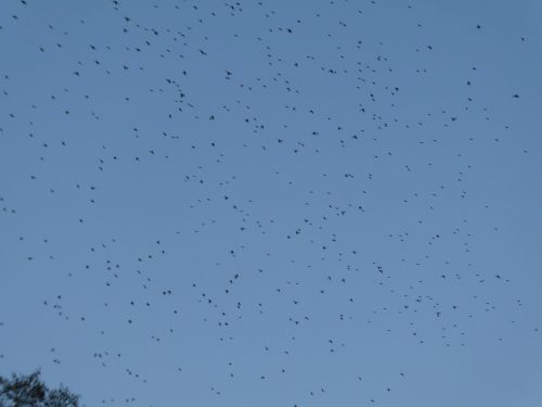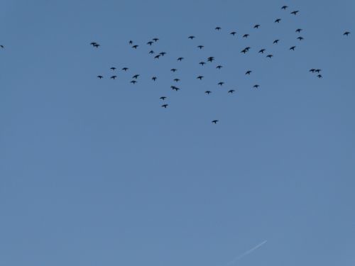 Ab und zu kommt mal ein kreischender Schwarm Kraniche vorbei, bis das Spektakel mit den Staren plötzlich anfängt.