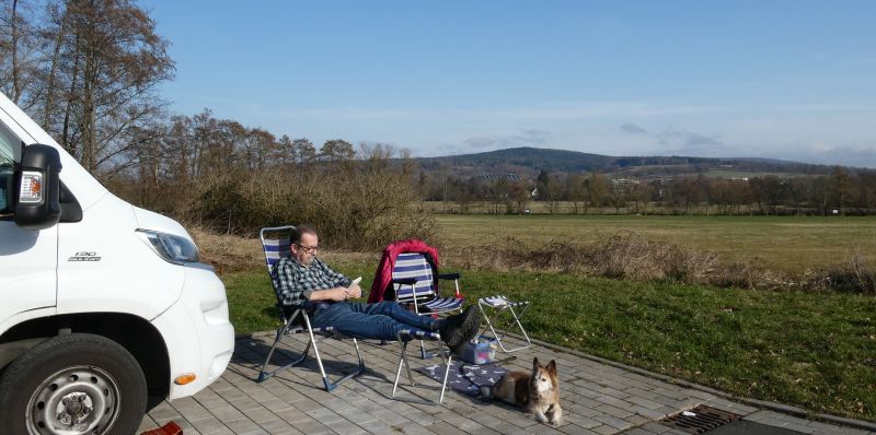 Der hintere Platz mit Blick in den Spessart ist frei, und wir verbringen nun einen gemütlichen Tag.