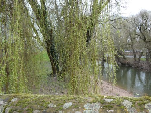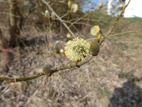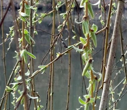 Die Weide treibt schon kräftig Kätzchen und Blätter,