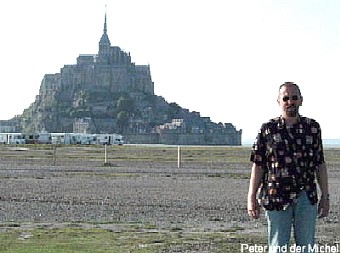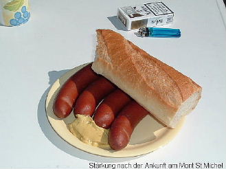 Riesenparkplatz, ca. 70 Womos, wir finden einen prima Platz in der ersten Reihe am Wasser (wo isses?) mit unverbaubarem Blick auf le Mont-St.Michel. Pause, Stühle raus und genießen. Zuerst den Blick auf den Hl. Michel, dann einen Irish-Coffee, dazu für jeden 2 Rindswürstchen vom Aldi und einen Himbi.