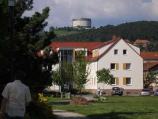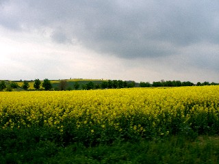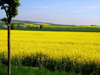 Die Fahrt geht auch heute wieder durch leuchtende Felder, über schmale holprige Straßen, durch meist kleine Ortschaften, und die Landschaft wird zwischendurch richtig hügelig, und sogar Weinberge gibts. Leider finden wir auf der engen Bundesstraße keinen Halteplatz, um diesen interessanten Hügel-Gebirgszug im Bild festzuhalten. Endlich kommen wir nach gefühlten 200 km - also 2 Stunden - in Bad Frankenhausen an.