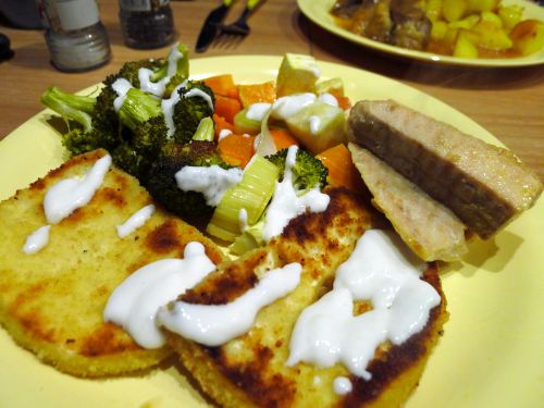 Zum Abendessen gabs von daheim mitgebrachtes kaltes Ofengemüse, Sellerieschnitzel mit Sylter Soße und Lachsfiletstreifen, für Peter den Rest Putenschenkel von gestern.