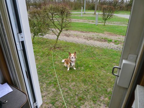 Unser Hund freut sich auch, endlich mal wieder raus zu können. Dann ist er aber entsetzt, dass er nicht wieder rein kann. Seine Leine hat sich an einem Grashalm verfangen und ich muss ihn retten.