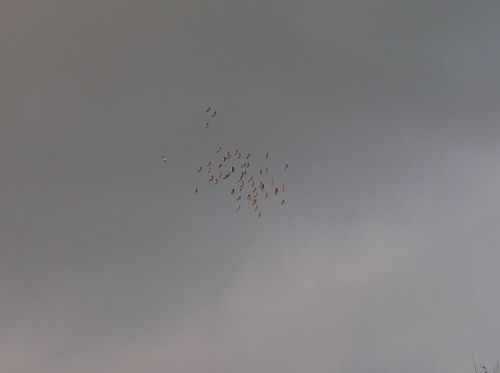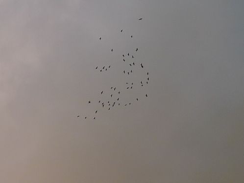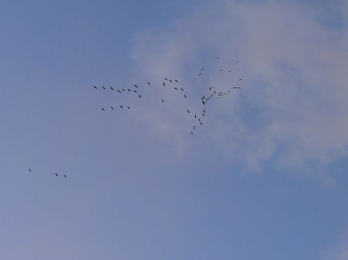 Gestern flogen die Kraniche über Mühlheim, und anstatt in V-Formation weiterzufliegen kreisten sie, als wollten sie sagen wir sollen mitkommen.
