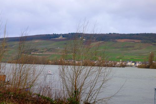 Blick aufs Niederwalddenkmal, und rechts sieht man die Benediktinerabtei St. Hildegard.