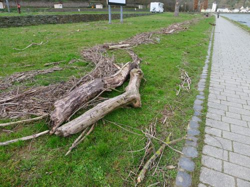 Hier hat der Rhein nicht mit Konfetti, sondern mit Holz geworfen. Jede Menge, und sogar riesige Brocken liegen hier rum.
