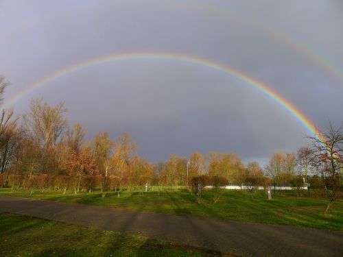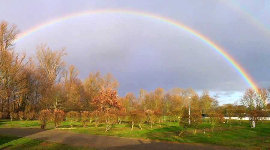 Ich wollte ja noch schnell runter zum Rhein laufen, denn über dem freien Gelände wäre dieser Regenbogen ein Traum gewesen. Aber ich war entweder zu lahm, oder das Wetter zu schnell. Also kam ich auch nicht am Topf voll Gold an, der sich am rechten Ende befindet.