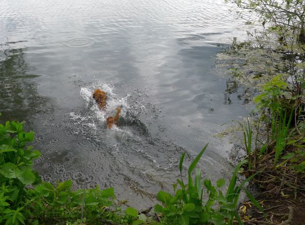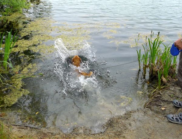 Hier sprang er vom erhöhten Ufer ohne Vorwarnung rein, weil er einen Ball im
