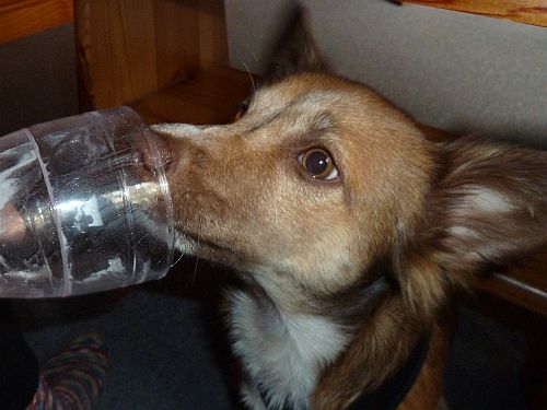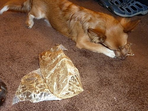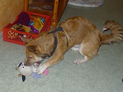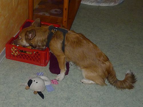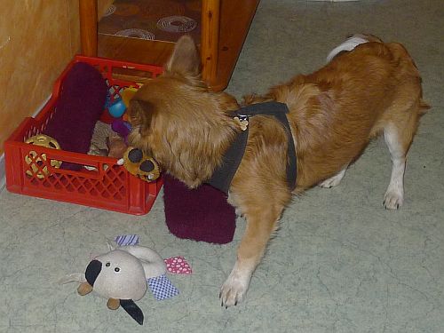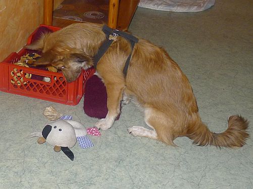 Zuerst bringt er den Filzschlappen zurück und holt die Knistertatze, legt sie aber wieder rein und entscheidet sich für ein Stück ausgelutschte Kopfhaut.