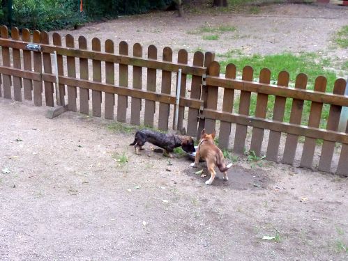 So kann Carl schonmal auf dem Gelände Kontakt mit gleichgroßen Hunden aufnehmen, und er stellt sich gar nicht mal so zimperlich an. Passt.