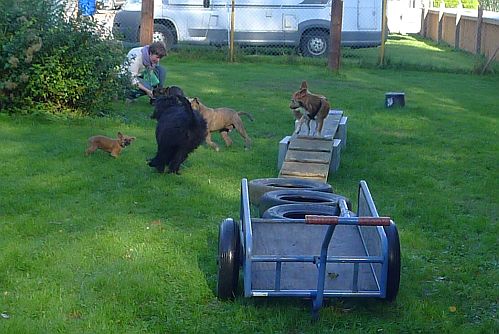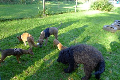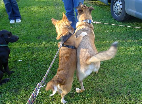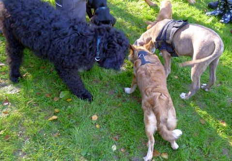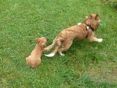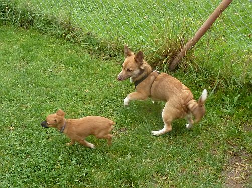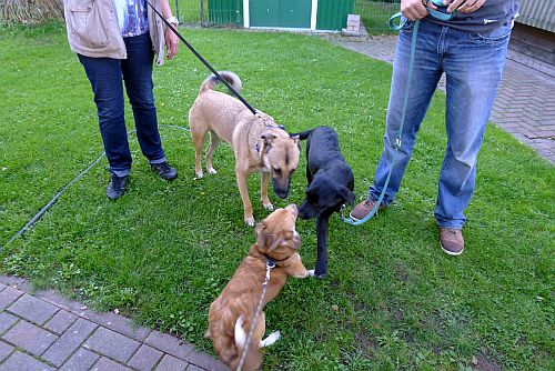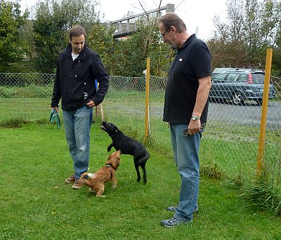 Die Begrüßung auf neutralem Boden war freundlich und frei von jedem Machogehabe, und auch die Stunde verlief klasse. Unser Carlchen hat sich prima benommen und war ganz angetan von einem spanischen Winzling. Und Paul ist ein Vorzeigeschüler. Er himmelt sein Herrchen an und lässt sich sogar beim Spiel abrufen. Da kann sich unser Wusel ne Scheibe abschneiden.