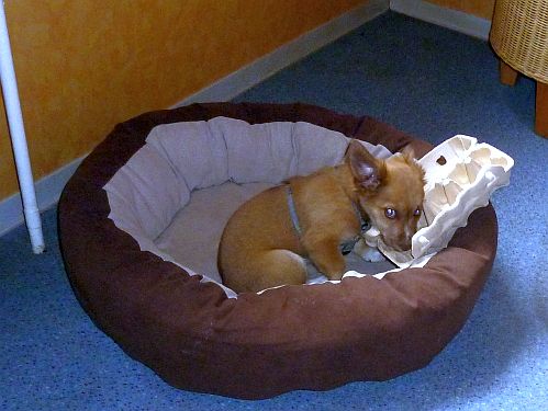 Heute kam Carl garnicht wirklich zur Ruhe. Sein Aktionsradius ist - gemessen an den letzten Tagen - zu groß, und er muss ständig irgendwas arbeiten. Er fiel zwar mittendrin immer mal todmüde um, aber kurz drauf gings weiter. Hier brachte erst die Transportbox das gewünschte Ergebnis. Nun schläft er selig, solange ich im Raum bleibe. Also bissi in Habachtstellung isser immernoch. Aber fürn ersten echten Tag zuhause ist das ok.