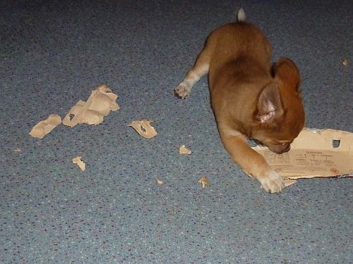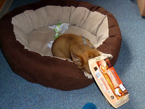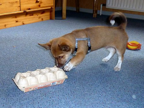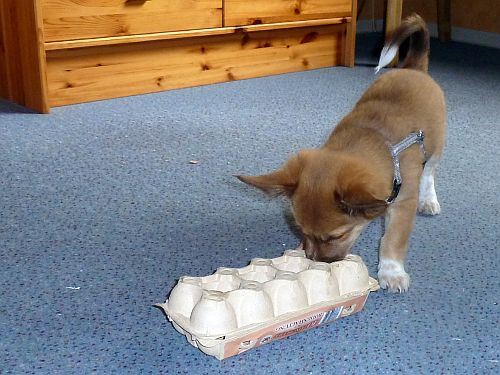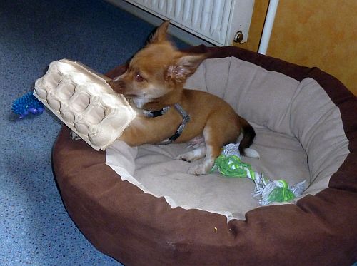 Nun hat er die Eierschachtel total zerlegt und ist enttäuscht, dass nur 3 Leckerchen drin waren.
