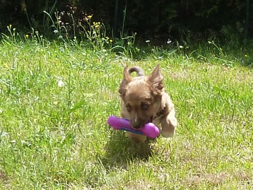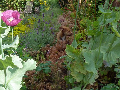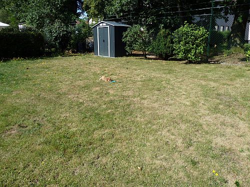 Dann wird der Garten getestet. Dabei dreht er voll auf. Endlich ohne Leine.