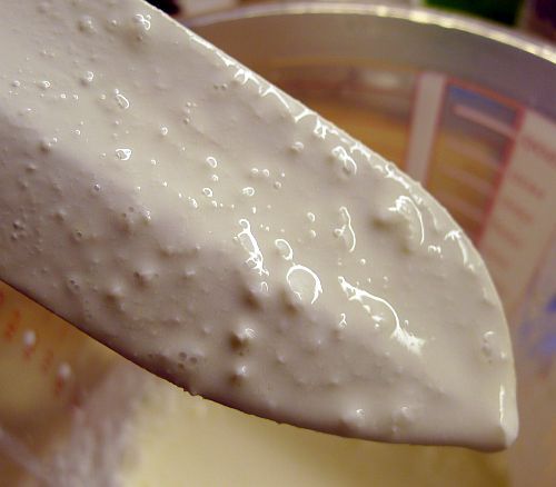 So sieht mein Kefir nach ca. 20 Stunden aus. Danach setzt sich die Molke stärker ab, und am 2. Tag schauts so aus. Um Quark/Frischkäse draus zu machen, ist das perfekt. Zum Trinken ist er mir dann aber schon zu sauer und auch zu dick.