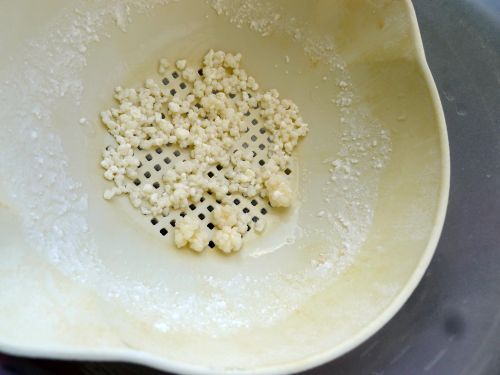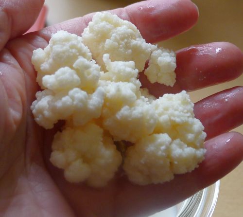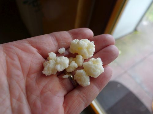 Als winzig kleine "Reiskörnchen" kam mein Kefir zu mir. Erst im Laufe des ersten Monats wuchsen sie und wurden so groß wie die 4 "Blumenkohlröschen" rechts im Sieb. Die Menge von einem Teelöffel reicht für einen halben Liter Milch.