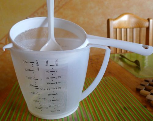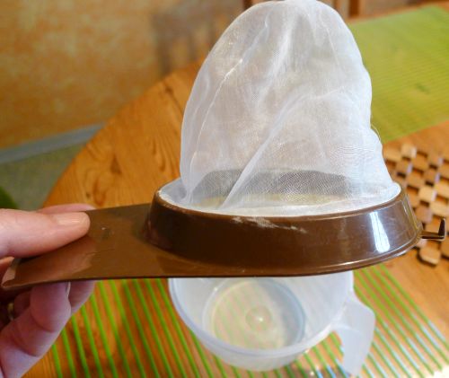 Um Quark bzw. Frischkäse zu machen lege ich ein Stück Mullwindel oder auch ein nassfestes Zewa in das Sieb und lasse den gut gereiften Kefir ein paar Stunden abtropfen. Im Keller hab ich noch aus VW-Bus-Zeiten einen Kaffee-Dauerfilter gefunden. Der eignet sich auch gut. Dann passts auch besser in den Kühlschrank und steht mir nicht in der Küche rum.
