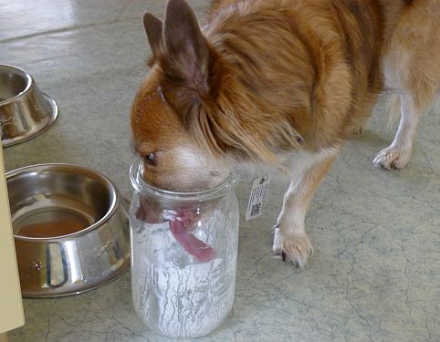 Anfangs hat Carlchen die Knollen verputzt, heute mag er nur noch den fertigen Kefir. Das Glas ausschlecken durfte er aber nur mal fürs Foto weil er die Zunge so schön lang macht. Ansonsten gibts Kefir in den Napf.