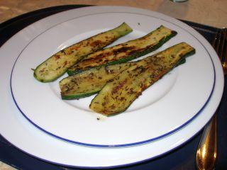 Kleine Zucchinis in dünne Scheiben schneiden und in einer Marinade aus italienischen Kräuter, Knobi, Pfeffer + Salz und Olivenöl über Nacht einlegen. Am nächsten Tag in der heißen Pfanne kurz ausbacken. Gut abgetropft kann man sie auch grillen. Schmeckt heiß, lauwarm und kalt.