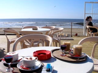 und die Wellen sehen dadurch richtig braun aus. Im Strandcafe machen wirs uns bei einem Cappu in der Sonne gemütlich und genießen den Blick aufs Wasser und das Treiben der Urlauber. Hier ist es schon wesentlich voller als auf Texel.