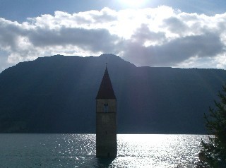 Kurz vor Nauders sehen wir endlich die ersehnten hohen Berge, und am Reschensee angekommen, ist unser Tagesziel erreicht. Wir sind geschafft, aber auf allen Parklätzen Übernachtungsverbot, und hinten an der Seilbahn steht auch kein einziges Womo.