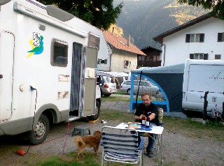 Nach einer kurzen Erholungspause gehts weiter nach nach Prad, denn da soll ein schöner Campingplatz sein. Pustekuchen, alles voll, bis auf einen winzigen Eckplatz am Ausgang neben der Entsorgungsstation, und keine Sicht auf Berge oder sonstwas. Alles vollgestopft mit Wohnwagen dicht an dicht, Wäscheleinen und weiß der Teufel. Nix für uns. Peter will nicht mehr fahren, hat die Schnauze voll, aber egal, durch die Apfelplantagen muss er weiter nach Latsch zum Adler. Dieser Campingplatz ist optimal. Günstig für Wandertouren, Lift direkt beim Platz - aber leider ebenfalls voll.
