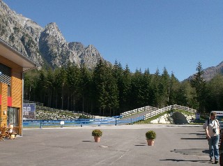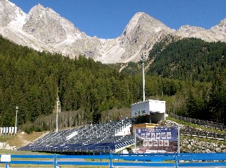 Strahlender Sonnenschein, aber müde Beine, und wir wollen doch den Antholzer See sehen. Also packen wir und fahren zum Antholzer Biathlon-Stadion. Dort gibts genügend Parkplätze.