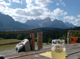 Aber erst gibts mal ein Radler, dann Speckknödel mit Krautsalat und hinterher einen Zirbelkiefer- und einen Almrosenschnaps. Ein fescher Geißenpeter spielt auf der Ziehharmonika und singt lustige und auch ernste Heimatlieder, und es ist fast schon kitschig, aber traumhaft schön.
