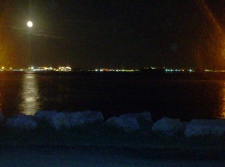 Ich wollte ja eigentlich heute interessehalber auf Union Lido sitzen, aber leider mögen die dort unsren Bruno nicht. Maxnix. Hier ists bestimmt romantischer, denn gerade waren wir nochmal gassi, und die Lichterkette der der Straße zum Parkplatz von Venedig spiegelt sich im Wasser. Schee.